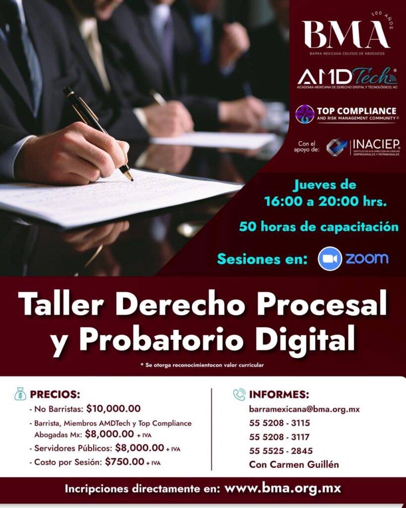 BMA Te informa del 15 de enero al 5 de febrero de 2026 TODAS LAS SESIONES 15 de enero 2026Comisión de Derecho Internacional y ComparadoComisión de ArbitrajeComisión de Derecho Mercantil“Arbitraje para Cambio Climático.” 14:30 hrs 20 de enero 2026Comisión de Medio Ambiente y Sostenibilidad“El Futuro del acceso a la Justicia Ambiental: implicaciones después de la reforma a la Ley de Amparo.” 8:00 hrs 22 de enero 2026Comisión de Tecnologías de la Información y Derechos DigitalesComisión de Derecho de la SaludComisión de Propiedad Intelectual“Defendiendo la integridad cognitiva en la era de inteligencia artificial.” 8:00 hrs 5 de febrero 2026Comisión de Tecnologías de la Información y Derechos Digitales Comisión de Igualdad, Género e Inclusión “La economía digital y la justicia con perspectiva de género: Retos y oportunidades para la abogacía en la era de la IA.” 8:00 hrs COMISIONES da clic para ver el contenido