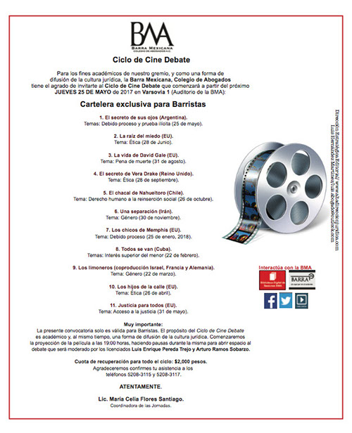Este mensaje está destinado para el uso del individuo o de la entidad a la cual está dirigido y puede contener información privada y/o confidencial. Si Usted recibe esta comunicación por error, evite su reproducción o distribución y notifique inmediatamente esta situación al remitente, eliminando de su computadora el mensaje o cualquier documento adjunto. Los mensajes de correo electrónico, así como cualquier información transmitida electrónicamente es susceptible de contener virus informáticos u otros mecanismos dañinos, por lo que es recomendable verificar los archivos adjuntos previo a su apertura. Barra Mexicana, Colegio de Abogados, A.C. en ningún caso será responsable por cualesquier daños, incluyendo de forma enunciativa y no limitativa, modificaciones de datos, pérdida de información e interrupción de actividades. La información contenida en la presente no constituye una opinión o pronunciamiento formal por parte de la Barra Mexicana, Colegio de Abogados, A.C. salvo en los casos en que así se haga constar en forma expresa y el documento correspondiente sea suscrito por los órganos de representación del colegio. Las opiniones vertidas en las publicaciones son responsabilidad de sus autores. Gracias.