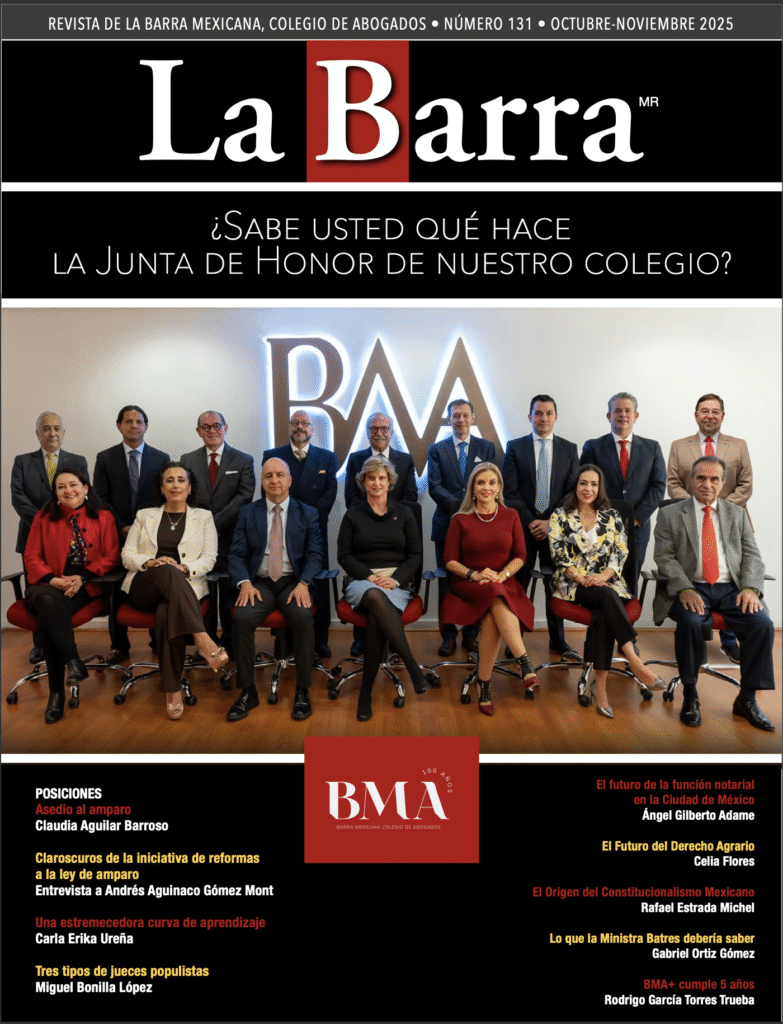 ¿Sabe usted qué hace la junta de honor de nuestro colegio?No. 131 clic aquí > Expresidentes de la Barra en la comida de la amistad 2025No. 130 clic aquí > Ricardo Ríos Ferrer y el Consejo General de la Abogacía MexicanaNo. 129 clic aquí > Ana María Kudisch Presidenta BMA 2025-2027No. 128 clic aquí > Ana Laura Magaloni Kerpel Premio Nacional de Jurisprudencia 2024No. 127 clic aquí > La Barra Mexicana siempre en pie de lucha en favor del Estado de Derecho No. 126 clic aquí > La Unidad en la Barra Mexicana es su Principal FortalezaNo. 125 clic aquí > El Nuevo Consejo Directivo a culminar el trabajo No. 124 clic aquí > XIX Congreso Nacional de Abogados No. 123 clic aquí > Javier Cremades Premio Nacional de Jurisprudencia 2023No. 122 clic aquí > Ana María Kudisch Castelló Primera Vicepresidenta BMANo. 121 clic aquí > Entrevista a Víctor Olea PeláezNo. 120 clic aquí > Premio al Mérito Barrista 2023 Lic. Jorge Enrique Roel PaniaguaNo. 119 clic aquí > Consejo Directivo 2023No. 118 clic aquí > Javier Quijano Paz No. 117 clic aquí > Consejo Directivo 2022No. 116 clic aquí > Jorge Alfredo Domínguez Martínez Premio Nacional de Jurisprudencia 2021 No. 115 clic aquí > Consejo Directivo 2021No. 114 clic aquí > Presidenta 2021-2023 Claudia De Buen Unna No. 113 clic aquí > Premio Nacional de Jurisprudencia 2020No. 112 clic aquí > HÉCTOR HERRERA ORDÓÑEZ Presidente febrero 2019-2021No. 111 clic aquí > Premio Nacional de Jurisprudencia 2019 José Ramón Cossío DíazNo. 110 clic aquí > Consejo Directivo 2019 No. 109 clic aquí > Presidente 2019-2020 Héctor Herrera OrdóñezNo. 108 clic aquí > Premio Nacional de Jurisprudencia 2018No. 107 clic aquí > Premio Pro Bono 2018No. 106 clic aquí > Consejo Directivo 2018 No. 105 clic aquí > Premio Nacional de Jurisprudencia 2017 Patricia Olamendi TorresNo. 104 clic aquí > Nuestra tradición es nuestro orgullo No. 103 clic aquí > Premio Pro Bono 2018No. 102 clic aquí > Consejo Directivo 2018 No. 101 clic aquí > Premio Nacional de Jurisprudencia 2017 Patricia Olamendi TorresNo. 100 clic aquí > Premio Pro Bono 2016No. 99 clic aquí > Retrospectiva y Prospectiva de la Constitución, a 100 años de su promulgaciónNo. 98 clic aquí > Premio Nacional de Jurisprudencia 2015 No. 97 clic aquí > La Colegiación y la Certificación obligatoria para la abogadaNo. 96 clic aquí > Premio Pro Bono 2015No. 95 clic aquí > Presidente 2015-2017 Ricardo Ríos FerrerNo. 94 clic aquí > Premio Nacional de Jurisprudencia 2014 No. 93 clic aquí > Premio Pro Bono 2014No. 92 clic aquí > XIV Congreso Nacional de AbogadosNo. 91 clic aquí > Premio Nacional de Jurisprudencia 2013 Enrique Calvo NicolauNo. 90 clic aquí > Comida Comisión de Derecho Penal No. 89 clic aquí > Premio Pro Bono 2013No. 88 clic aquí > Presidente 2013-2014 Gabriel Ortiz GómezNo. 87 clic aquí > Premio Nacional de Jurisprudencia 2012 No. 86 clic aquí > Homenaje a Barristas que cumplen 50 años de ejercicio profesional No. 85 clic aquí > Premio Pro Bono 2012No. 84 clic aquí > XIII Congreso Nacional de Abogados No. 83 clic aquí > Premio Nacional de Jurisprudencia 2011 No. 82 clic aquí > Homenaje a Barristas que cumplen 50 años de ejercicio profesional No. 81 clic aquí > Entrega del Premio Pro Bono 2011No. 80 clic aquí > Miembro Honorario de la Barra Mexicana, Colegio de Abogados No. 79 clic aquí > Presidente 2011-2012 Luis Alfonso Madrigal Pereyra No. 78 clic aquí > Develación de la fotografía de Luis Enrique Graham Tapia No. 77 clic aquí > Entrega del Premio Pro Bono 2010No. 76 clic aquí > XII Congreso Nacional de Abogados No. 75 clic aquí > Premio Nacional de Jurisprudencia 2009 No. 74 clic aquí > Entrega del Premio Pro Bono 2009 No. 73 clic aquí > La Comisión de Derecho PenalNo. 72 clic aquí > Magda María del Carmen Alanos Figueroa No. 71 clic aquí > Presidente 2009-2010 Carlos Loperana Ruiz No. 70 clic aquí > ¿Qué es la Barra? Retos para el futuro No. 69 clic aquí > Responsabilidad Internacional frente al Daño AmbientalNo. 68 clic aquí > XI Congreso Nacional de AbogadosNo. 67 clic aquí > La iniciativa de reforma petrolera: comentarios sobre la propuesta No. 66 clic aquí > Premio Nacional de Jurisprudencia Lic. Manuel Lizardi Albarrán No. 65 clic aquí > ¿Qué nos espera en el 2008 en la Reforma Fiscal?No. 64 clic aquí > Informe de Gobierno y la ConstituciónNo. 63 clic aquí > Derecho a la vida: Propio o ajeno No. 62 clic aquí > Origen Histórico No. 61 clic aquí > Presidente 2007-2008No. 60 clic aquí > Premio Nacional de Jurisprudencia 2006No. 59 clic aquí > Homenaje a Barristas que cumplen 50 años de Ejercicio ProfesionalNo. 58 clic aquí > X Congreso Nacional de Abogados No. 57 clic aquí > Develación de la fotografía de Emilio González de Castilla del ValleNo. 56 clic aquí > Premio Pro Bono 2006 Alberto Román PalenciaNo. 55 clic aquí > Consejo Directivo 2006No. 54 clic aquí > Premio Nacional de Jurisprudencia 2005 No. 53 clic aquí > Homenaje a Barristas que cumple 50 años de Ejercicio ProfesionalNo. 52 clic aquí > 9º Congreso Nacional de AbogadosNo. 51 clic aquí > Tercer Concierto “Por un mejor acceso a la justicia”No. 50 clic aquí > 9º Congreso Nacional de Abogados No. 49 clic aquí > Presidente 2005-2006 Fabián Aguinaco BravoNo. 48 clic aquí > Premio Nacional de Jurisprudencia 2004No. 47 clic aquí > Homenaje a Barristas que cumplen 50, 60 y más años de Ejercicio Profesional No. 46 clic aquí > Segundo Concierto de la Asociación de Servicios Legales No. 45 clic aquí > Develación de la fotografía de Emilio González de Castilla del ValleNo. 44 clic aquí > 10º Aniversario de la Revista La BarraNo. 43 clic aquí > Diagnostico y propuestas sobre los Sistemas de Impartición de Justicia en México No. 42 clic aquí > Premio Nacional de Jurisprudencia No. 41 clic aquí > Práctica TransfronterizaNo. 40 clic aquí > Museo Franz MayorNo. 39 clic aquí > Coordinadores de Comisiones 2003No. 38 clic aquí > P