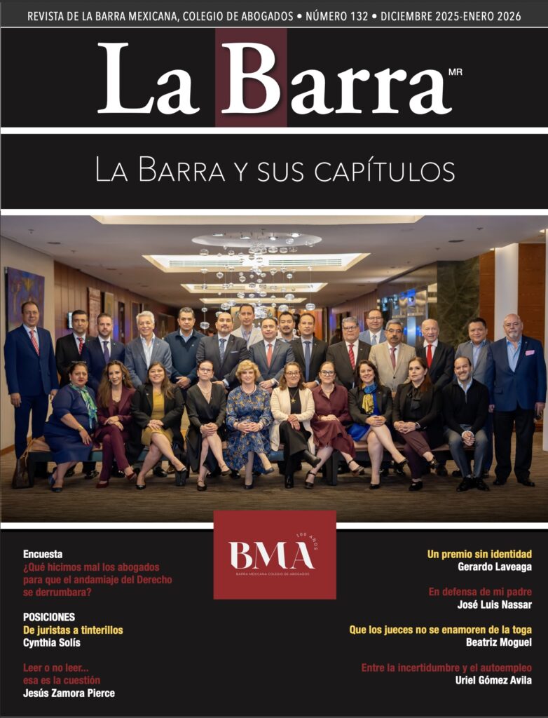 La Barra y sus CapítulosNo. 132 clic aquí > ¿Sabe usted qué hace la junta de honor de nuestro colegio?No. 131 clic aquí > Expresidentes de la Barra en la comida de la amistad 2025No. 130 clic aquí > Ricardo Ríos Ferrer y el Consejo General de la Abogacía MexicanaNo. 129 clic aquí > Ana María Kudisch Presidenta BMA 2025-2027No. 128 clic aquí > Ana Laura Magaloni Kerpel Premio Nacional de Jurisprudencia 2024No. 127 clic aquí > La Barra Mexicana siempre en pie de lucha en favor del Estado de Derecho No. 126 clic aquí > La Unidad en la Barra Mexicana es su Principal FortalezaNo. 125 clic aquí > El Nuevo Consejo Directivo a culminar el trabajo No. 124 clic aquí > XIX Congreso Nacional de Abogados No. 123 clic aquí > Javier Cremades Premio Nacional de Jurisprudencia 2023No. 122 clic aquí > Ana María Kudisch Castelló Primera Vicepresidenta BMANo. 121 clic aquí > Entrevista a Víctor Olea PeláezNo. 120 clic aquí > Premio al Mérito Barrista 2023 Lic. Jorge Enrique Roel PaniaguaNo. 119 clic aquí > Consejo Directivo 2023No. 118 clic aquí > Javier Quijano Paz No. 117 clic aquí > Consejo Directivo 2022No. 116 clic aquí > Jorge Alfredo Domínguez Martínez Premio Nacional de Jurisprudencia 2021 No. 115 clic aquí > Consejo Directivo 2021No. 114 clic aquí > Presidenta 2021-2023 Claudia De Buen Unna No. 113 clic aquí > Premio Nacional de Jurisprudencia 2020No. 112 clic aquí > HÉCTOR HERRERA ORDÓÑEZ Presidente febrero 2019-2021No. 111 clic aquí > Premio Nacional de Jurisprudencia 2019 José Ramón Cossío DíazNo. 110 clic aquí > Consejo Directivo 2019 No. 109 clic aquí > Presidente 2019-2020 Héctor Herrera OrdóñezNo. 108 clic aquí > Premio Nacional de Jurisprudencia 2018No. 107 clic aquí > Premio Pro Bono 2018No. 106 clic aquí > Consejo Directivo 2018 No. 105 clic aquí > Premio Nacional de Jurisprudencia 2017 Patricia Olamendi TorresNo. 104 clic aquí > Nuestra tradición es nuestro orgullo No. 103 clic aquí > Premio Pro Bono 2018No. 102 clic aquí > Consejo Directivo 2018 No. 101 clic aquí > Premio Nacional de Jurisprudencia 2017 Patricia Olamendi TorresNo. 100 clic aquí > Premio Pro Bono 2016No. 99 clic aquí > Retrospectiva y Prospectiva de la Constitución, a 100 años de su promulgaciónNo. 98 clic aquí > Premio Nacional de Jurisprudencia 2015 No. 97 clic aquí > La Colegiación y la Certificación obligatoria para la abogadaNo. 96 clic aquí > Premio Pro Bono 2015No. 95 clic aquí > Presidente 2015-2017 Ricardo Ríos FerrerNo. 94 clic aquí > Premio Nacional de Jurisprudencia 2014 No. 93 clic aquí > Premio Pro Bono 2014No. 92 clic aquí > XIV Congreso Nacional de AbogadosNo. 91 clic aquí > Premio Nacional de Jurisprudencia 2013 Enrique Calvo NicolauNo. 90 clic aquí > Comida Comisión de Derecho Penal No. 89 clic aquí > Premio Pro Bono 2013No. 88 clic aquí > Presidente 2013-2014 Gabriel Ortiz GómezNo. 87 clic aquí > Premio Nacional de Jurisprudencia 2012 No. 86 clic aquí > Homenaje a Barristas que cumplen 50 años de ejercicio profesional No. 85 clic aquí > Premio Pro Bono 2012No. 84 clic aquí > XIII Congreso Nacional de Abogados No. 83 clic aquí > Premio Nacional de Jurisprudencia 2011 No. 82 clic aquí > Homenaje a Barristas que cumplen 50 años de ejercicio profesional No. 81 clic aquí > Entrega del Premio Pro Bono 2011No. 80 clic aquí > Miembro Honorario de la Barra Mexicana, Colegio de Abogados No. 79 clic aquí > Presidente 2011-2012 Luis Alfonso Madrigal Pereyra No. 78 clic aquí > Develación de la fotografía de Luis Enrique Graham Tapia No. 77 clic aquí > Entrega del Premio Pro Bono 2010No. 76 clic aquí > XII Congreso Nacional de Abogados No. 75 clic aquí > Premio Nacional de Jurisprudencia 2009 No. 74 clic aquí > Entrega del Premio Pro Bono 2009 No. 73 clic aquí > La Comisión de Derecho PenalNo. 72 clic aquí > Magda María del Carmen Alanos Figueroa No. 71 clic aquí > Presidente 2009-2010 Carlos Loperana Ruiz No. 70 clic aquí > ¿Qué es la Barra? Retos para el futuro No. 69 clic aquí > Responsabilidad Internacional frente al Daño AmbientalNo. 68 clic aquí > XI Congreso Nacional de AbogadosNo. 67 clic aquí > La iniciativa de reforma petrolera: comentarios sobre la propuesta No. 66 clic aquí > Premio Nacional de Jurisprudencia Lic. Manuel Lizardi Albarrán No. 65 clic aquí > ¿Qué nos espera en el 2008 en la Reforma Fiscal?No. 64 clic aquí > Informe de Gobierno y la ConstituciónNo. 63 clic aquí > Derecho a la vida: Propio o ajeno No. 62 clic aquí > Origen Histórico No. 61 clic aquí > Presidente 2007-2008No. 60 clic aquí > Premio Nacional de Jurisprudencia 2006No. 59 clic aquí > Homenaje a Barristas que cumplen 50 años de Ejercicio ProfesionalNo. 58 clic aquí > X Congreso Nacional de Abogados No. 57 clic aquí > Develación de la fotografía de Emilio González de Castilla del ValleNo. 56 clic aquí > Premio Pro Bono 2006 Alberto Román PalenciaNo. 55 clic aquí > Consejo Directivo 2006No. 54 clic aquí > Premio Nacional de Jurisprudencia 2005 No. 53 clic aquí > Homenaje a Barristas que cumple 50 años de Ejercicio ProfesionalNo. 52 clic aquí > 9º Congreso Nacional de AbogadosNo. 51 clic aquí > Tercer Concierto “Por un mejor acceso a la justicia”No. 50 clic aquí > 9º Congreso Nacional de Abogados No. 49 clic aquí > Presidente 2005-2006 Fabián Aguinaco BravoNo. 48 clic aquí > Premio Nacional de Jurisprudencia 2004No. 47 clic aquí > Homenaje a Barristas que cumplen 50, 60 y más años de Ejercicio Profesional No. 46 clic aquí > Segundo Concierto de la Asociación de Servicios Legales No. 45 clic aquí > Develación de la fotografía de Emilio González de Castilla del ValleNo. 44 clic aquí > 10º Aniversario de la Revista La BarraNo. 43 clic aquí > Diagnostico y propuestas sobre los Sistemas de Impartición de Justicia en México No. 42 clic aquí > Premio Nacional de Jurisprudencia No. 41 clic aquí > Práctica TransfronterizaNo. 40 clic aquí > Museo Franz MayorNo. 39 clic aquí > Coordin