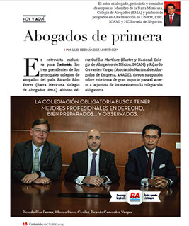 "En una entrevista exclusiva para la revista Contenido (octubre, 2015), los tres presidentes de los principales colegios de abogados del país, Ricardo Ríos Ferrer (Barra Mexicana, Colegio de Abogados, BMA), Alfonso Pérez-Cuéllar Martínez (Ilustre y Nacional Colegio de Abogados de México, INCAM) y Ricardo Cervantes Vargas (Asociación Nacional de Abogados de Empresa, ANADE) hablaron para los lectores de la revista sobre un tema de gran relevancia e impacto para el acceso a la justicia