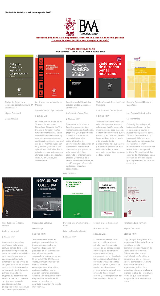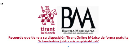 Este mensaje está destinado para el uso del individuo o de la entidad a la cual está dirigido y puede contener información privada y/o confidencial. Si Usted recibe esta comunicación por error, evite su reproducción o distribución y notifique inmediatamente esta situación al remitente, eliminando de su computadora el mensaje o cualquier documento adjunto. Los mensajes de correo electrónico, así como cualquier información transmitida electrónicamente es susceptible de contener virus informáticos u otros mecanismos dañinos, por lo que es recomendable verificar los archivos adjuntos previo a su apertura. Barra Mexicana, Colegio de Abogados, A.C. en ningún caso será responsable por cualesquier daños, incluyendo de forma enunciativa y no limitativa, modificaciones de datos, pérdida de información e interrupción de actividades. La información contenida en la presente no constituye una opinión o pronunciamiento formal por parte de la Barra Mexicana, Colegio de Abogados, A.C. salvo en los casos en que así se haga constar en forma expresa y el documento correspondiente sea suscrito por los órganos de representación del colegio. Las opiniones vertidas en las publicaciones son responsabilidad de sus autores. Gracias.